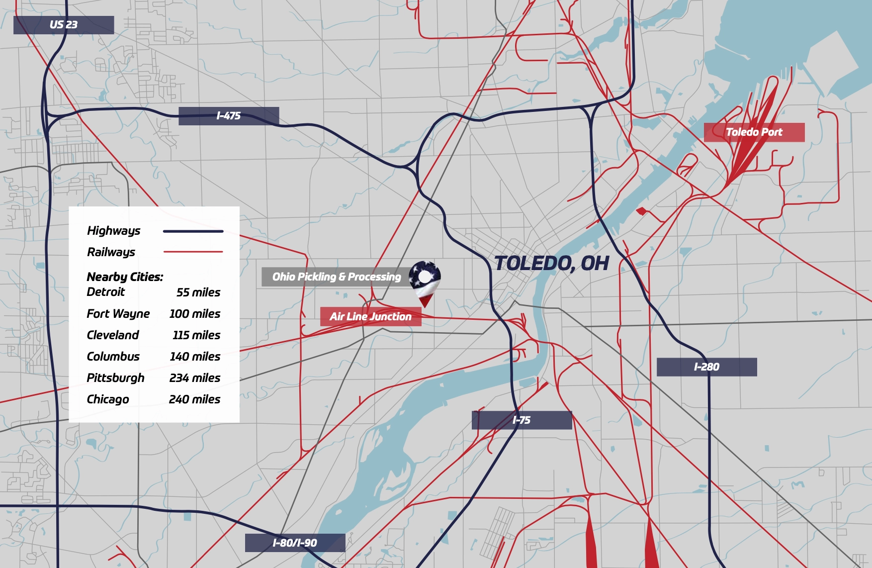 Ohio Pickling & Processing has a large 200,000 square foot climate-controlled warehousing facility for safe storage of customers' inventory. An additional 15 acres of outdoor storage is used for pre-process material that does not require indoor storage. With four overhead cranes (up to 35 ton capacity) and an expansive receiving area with direct rail service, delivery and shipping of customers' product is efficient and secure.